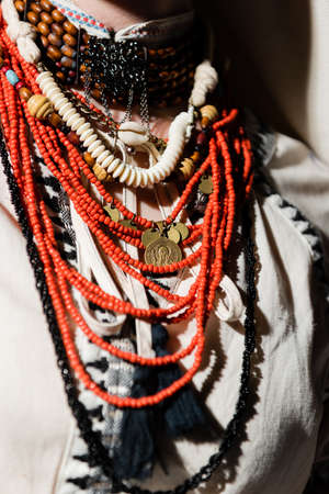 partial view of ukrainian woman in traditional clothing with ornament and red beads