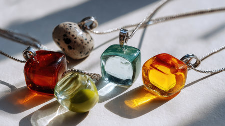 A stunning arrangement of colorful glass pendants featuring unique shapes, illuminated by natural light, suitable for artistic and fashion-focused projects.