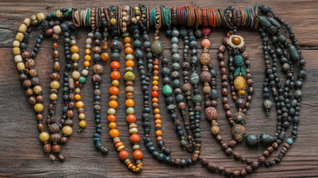 A stunning arrangement of colorful beaded necklaces resting on a rustic wooden surface. This image showcases unique designs and vibrant colors ideal for fashion and artistic inspiration.