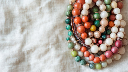 A vibrant collection of colorful beads and jewelry displayed on a textured fabric background, showcasing craftsmanship and style in accessory design.