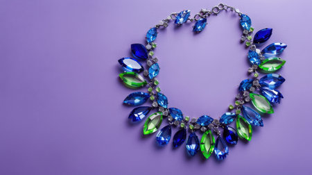 This exquisite statement necklace features a stunning arrangement of blue and green gemstones, creating a vibrant and eye-catching accessory on a soft purple backdrop.