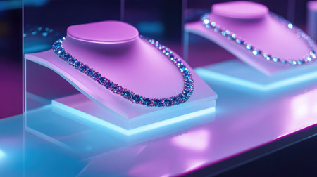 This captivating image features exquisite gemstone necklaces displayed elegantly in a stylish showcase, enhanced by soft, colorful lighting to highlight their beauty and craftsmanship.