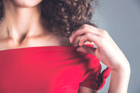 young woman caressing her neck with her fingers on gray background