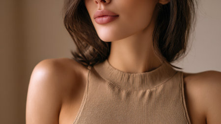 A woman with shoulder-length brown hair and smooth skin poses in a sleeveless beige top, gazing slightly to the side, with a soft and natural expression against a blurred background