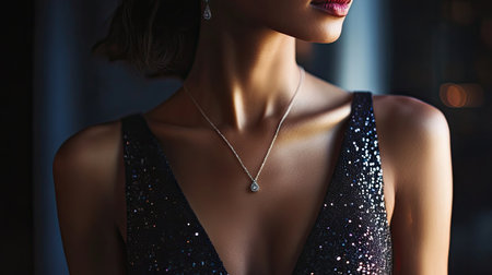 A stunning portrait of a woman adorned in exquisite jewelry, featuring a delicate necklace and earrings. The soft lighting creates an elegant atmosphere, emphasizing her beauty and sophistication.