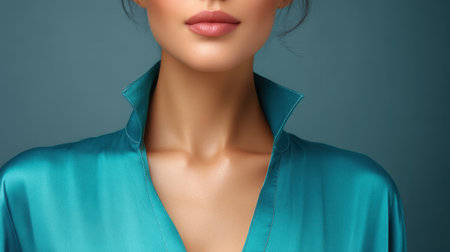 A stunning portrait of an elegant woman wearing a turquoise silk blouse. Her flawless skin and glossy lips highlight confidence and serene beauty in this minimalist aesthetic.