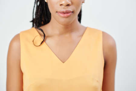 Cropped image of serious young woman with full lips standing in yellow top