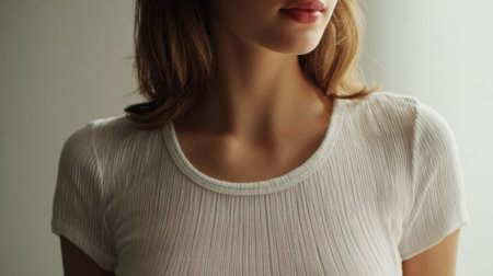 A close-up shot focusing on the neck and collarbone of an individual wearing a plain v-neck t-shirt. The lighting creates subtle shadows and highlights.
