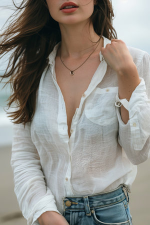 Close-up of a beautiful girl in a white shirt on the beach.