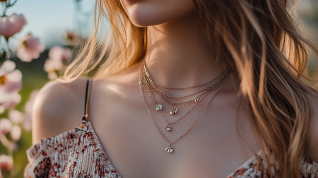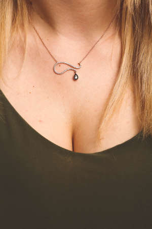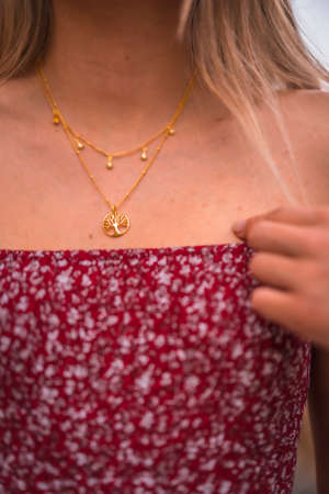 Close-up of a necklace on the neck of a young woman