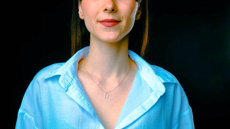 Close-up showcases neckline and shoulder contours against studio background. Elegance with smooth and healthy skin. Concept of natural beauty, female health, fashion and style. Ad
