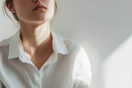 Elegant portrait of a young woman in a white shirt, showcasing a calm emotion captured in soft natural light against a minimalist backdrop