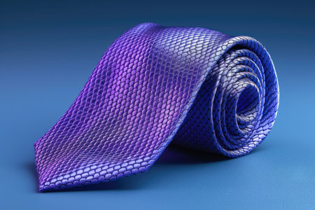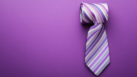 A rolled purple striped tie is displayed against a vibrant lavender background, ideal for fashion, business, or creative projects, highlighting elegance.