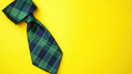 This image showcases a stylish plaid tie featuring a green and navy pattern set against a bright yellow background, ideal for fashionable outfits and accessories.