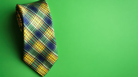 A vibrant plaid tie featuring a mix of green, yellow, and blue colors on a solid green background, ideal for fashion brands and accessory promotions.