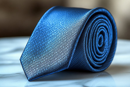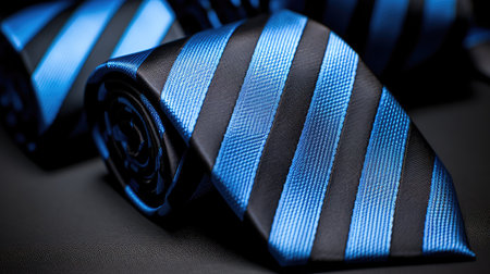 A detailed close-up of a dark blue tie with subtle stripes, showing its smooth texture and elegance, perfect for corporate style.