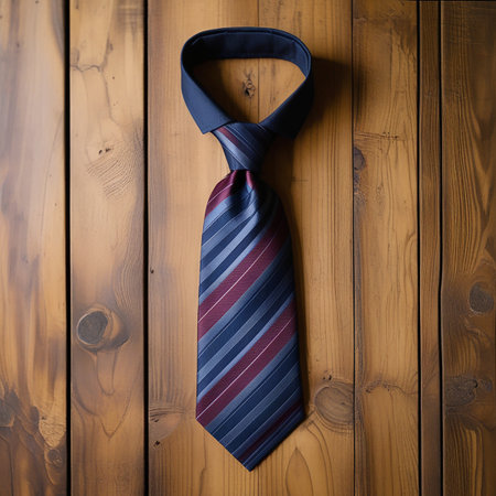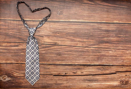 Striped men's tie on a wood background.