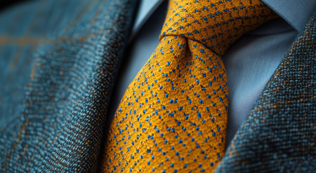 Close-up of a well-dressed individual showcasing a colorful dotted tie paired with a textured blazer. The setting suggests a professional or formal occasion.