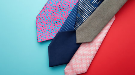 This vibrant image features a diverse collection of stylish ties arranged on a colorful background, showcasing various textures and patterns ideal for fashion enthusiasts.
