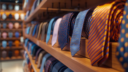 Variety of tie patterns and colors exhibited in a shop or showroom