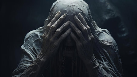 the creature, frozen in shock, stands amidst a dark, tenebrous atmosphere, its aged, ashen skin illuminated by bold, dynamic lines, evoking a sense of hyper-realistic sci-fi, reminiscent of alessio albi's style, crafted with minimal retouching using bryce 3d, and infused with a grainy, emotional intensity, a la andrew ferez. ai generated