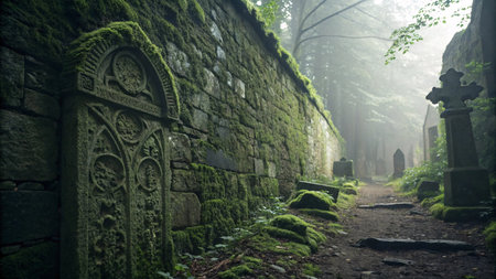 A captivating graveyard scene featuring glowing green crosses on gravestones, surrounded by lush moss and fog, creating an eerie yet mystical atmosphere.