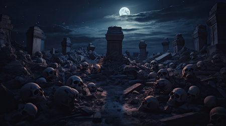Mysterious Moonlit Cemetery with Ancient Gravestones and Misty Atmosphere at Nightfall AI Generative