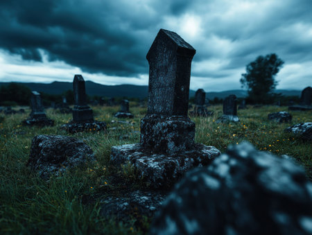 A rustic cemetery, weathered tombstones under a stormy sky, creates an eerie, dramatic solitude Ancient grave markers face a darkening horizon, evoking somber reflection This solemn landscape offers a place of history, remembrance, and contemplation Its moody atmosphere adds mystery or melancholy to any project AI Generative