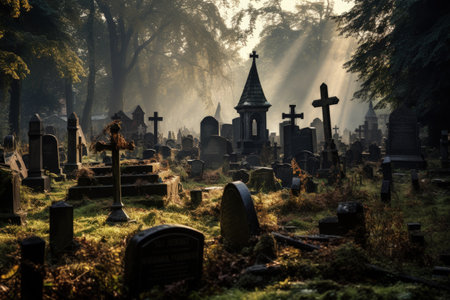 A graveyard with tombstones and crosses, set against the backdrop of a cemetery, Ancient cemetery with ghostly figures floating between the tombstones, AI Generated