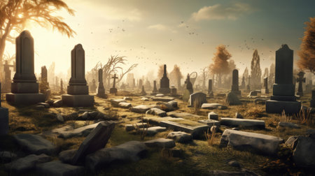 Photorealistic cemetery with dark storm horror cinematic feel. UHD quality Generative AI Generated
