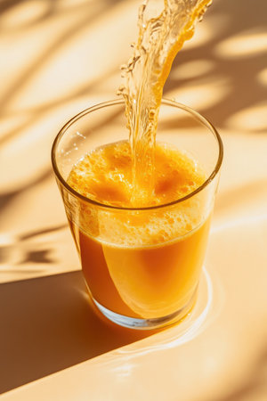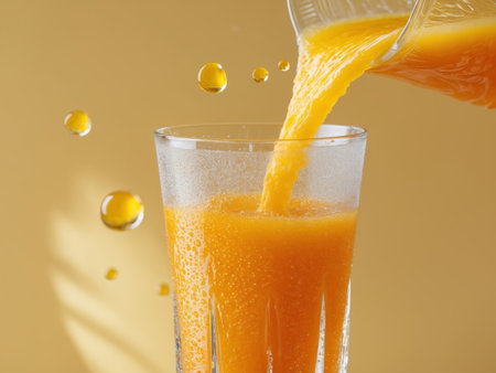 Close-Up of Orange Juice Flowing into Glass with Glowing Sunshine Effects