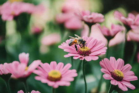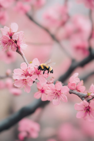 A bee pollinates pink flowers in a spring garden, showcasing nature s beauty and pollination process