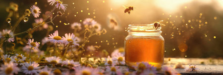 A jar of honey in a blooming meadow full of bees at sunset. Beekeeping concept. Natural organic honey