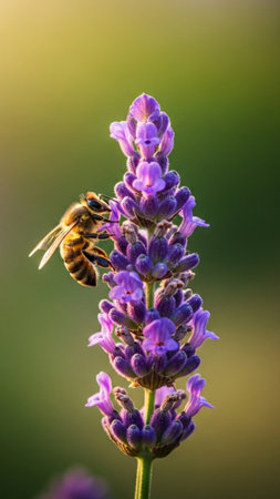 A serene close-up captures a bee pollinating vibrant purple daisies, creating a tranquil atmosphere. The dreamy bokeh adds soft light and beauty to a natural garden scene.