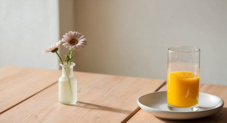 AI Generated. Bright morning with fresh orange juice and flowers on wooden table