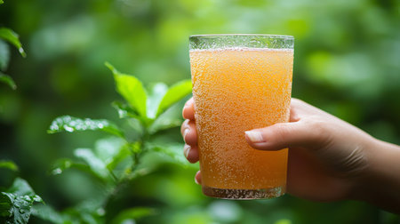 A person holding a glass of juice in their hand, showing a refreshing and healthy beverage choice.