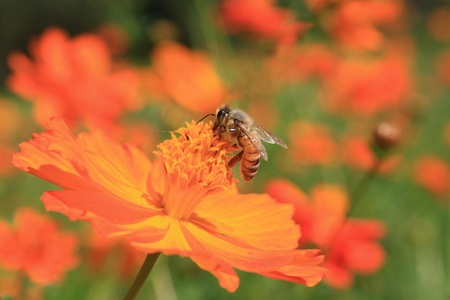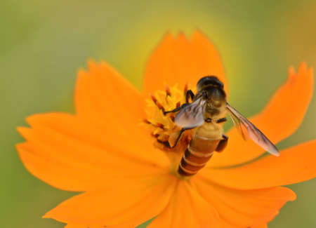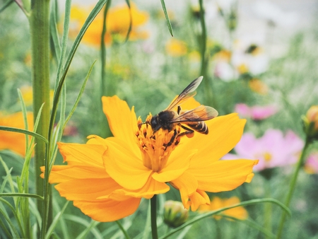 Bee collecting pollen at yellow flower. Bee flying over the yellow flower in blur background