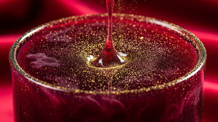 A macro shot captures gold glitter cascading into a dark red, viscous liquid within a glass. The glitter creates a shimmering halo as it disperses, and a central ripple forms where the liquid is disturbed. The deep red hue of the liquid contrasts with the bright gold particles, creating a visually striking and effect. The focus is on the dynamic interaction of the glitter and liquid, highlighting texture and movement.