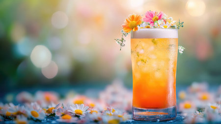 A vibrant cocktail adorned with flowers, set against a dreamy background, capturing the essence of summer festivities and refreshing moments.