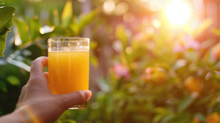 Close-up of a hand holding a glass of orange juice against a sunny, plant-filled backdrop