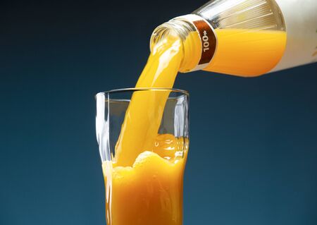 Pouring orange juice into a glass, on a blue background. Glass of orange juice on a colorful table in bright light.