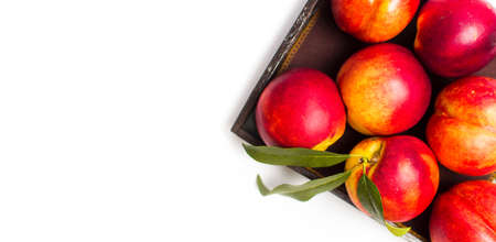 Zenith view. Group of nectarines inside a box. White background and copy space.