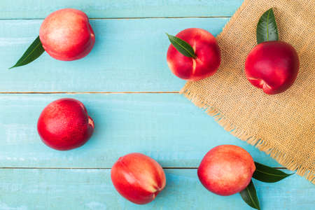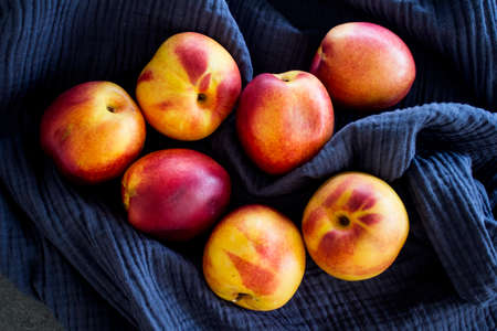 Fresh nectarines on blue kitchen towel. Top view photo of juicy fruits. Healthy eating concept.