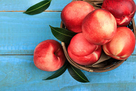 Wicker box with sweet ripe nectarines as background