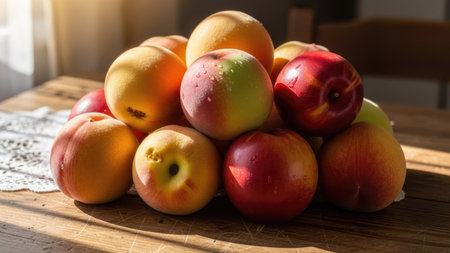A pile of various ripe fruits, predominantly apples and peaches, rests on a rustic wooden surface. The composition captures the natural textures of the fruits and wood. Warm sunlight illuminates the scene, enhancing the colors and casting soft shadows. Suitable for illustrating healthy eating or food-related themes.