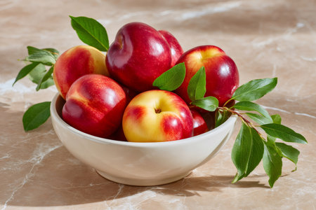 Fresh nectarines with green leaves filling a white bowl on a light marble surface