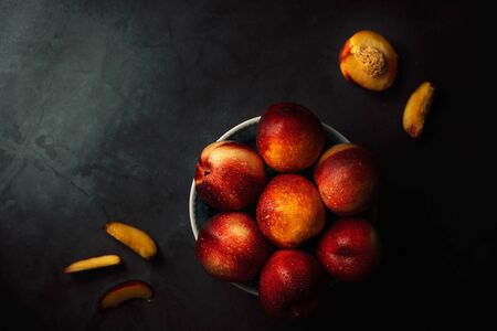 Still life of fresh delicious sweet nectarines with droplets of water in a bowl on dark background. Low key. Top view.