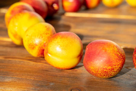 ripe juicy nectarines are laid out in a row on a wooden background. fruit harvest