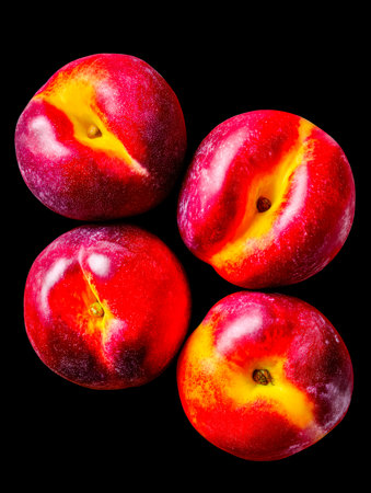 few nectarines on a dark mirror background.