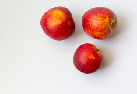 Three ripe nectarine fruits isolated on white background copy space. Healthy food